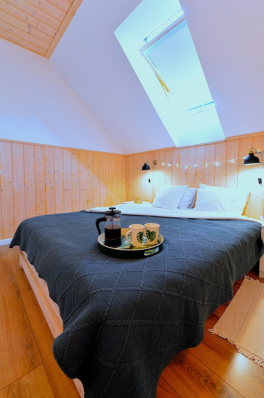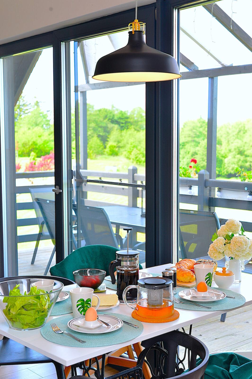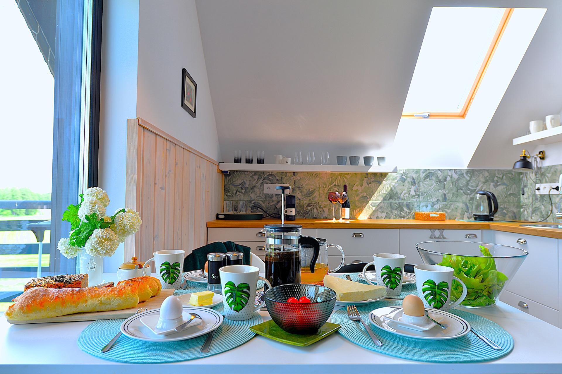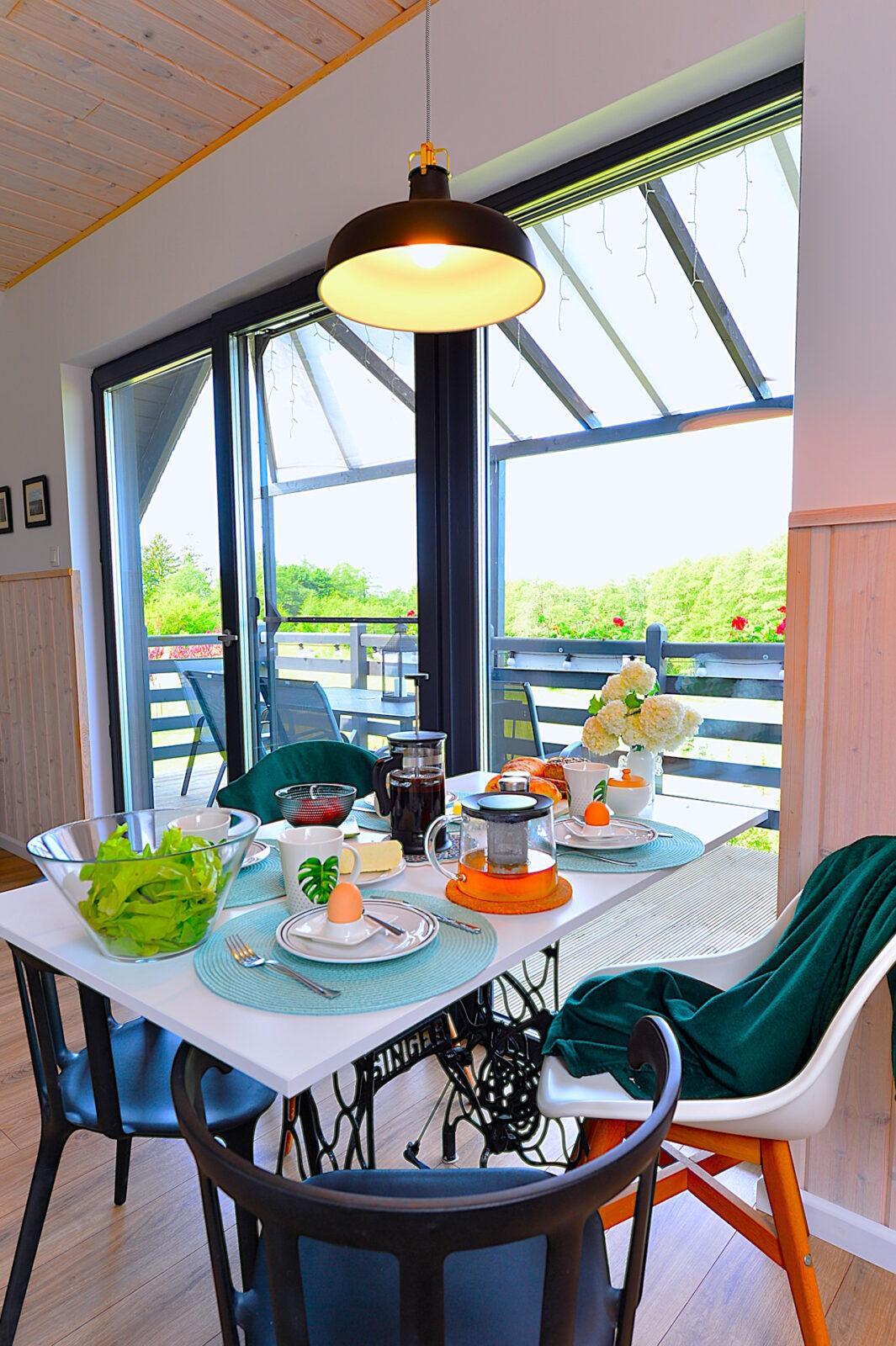 Nasz domek jest drewniany. Staraliśmy się używać do jego budowy tylko naturalnych elementów, takich jak drewno, kamień, szkło. Apartamenty są urządzone w stylu skandynawskim, z prostotą, ale ze smakiem. Obydwa apartamenty mają tarasy z przepięknym widokiem, a zachody słońca u nas są naprawdę magiczne.